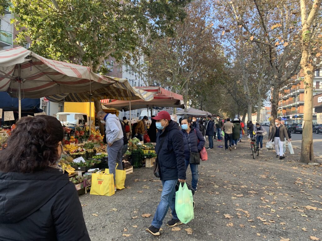 前回閉まっていた青空市場も今回は開いています。前回ロックダウン後に再開した時でも、はじめの頃は市場を柵で囲い、中に入れる人の数を制限し、入る前に一人一人体温を測っていましたが、今回はそれもありませんでした。その代わり、普段市場は普段左右にお店を開いていますが、今回は片側だけにお店を集め、食品以外の洋服や雑貨関係のお店は開いていませんでした。