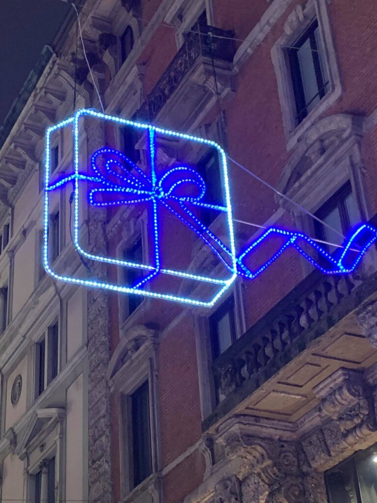 普段のイタリアは、日曜に閉まっているお店でも(以前日曜日の営業は、特別な許可がないとできませんでした)クリスマスの1ヶ月前から日曜日にもお店を開くことができたので、クリスマスまでの1ヶ月はいつもお店が開いていて、街や商店街のデコレーションも設置され、とてもクリスマスっぽい雰囲気になっていました。今年もちょっとしたデコレーションはありますが、いつもよりもだいぶ賑やかさに欠けています。クリスマスのライティングがあっても、あまり客がお店に入っていません。