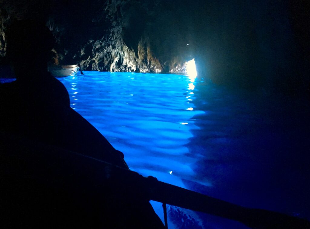 青の洞窟は、地盤沈下によって海面下に沈んだ真っ暗な洞窟の中に、水面にわずかに開いた穴から洞窟内に入ってくる日光が、海の水に反射することでとても美しいエレクトリックブルーに輝いている場所です。