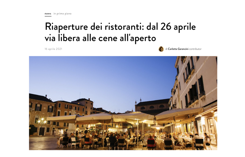 イタリアでは、レストラン再開: 4月26日より外でのレストランの夕食が認められる。という発表がありました。