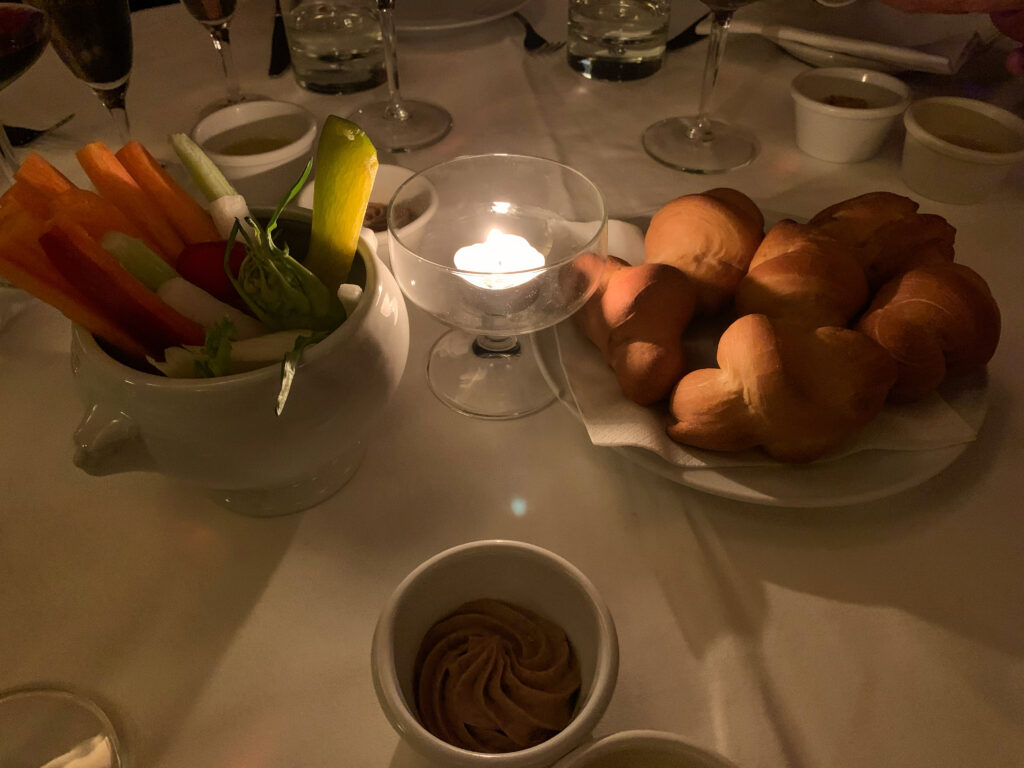 ディナーの時の入り口は、中が少し暗くしてあって、とてもエレガントな雰囲気になっています。まず座ったらプロセッコのサービスがあり、美味しいスティック野菜と、パテが出て来て、それから料理へと続いて行きます。