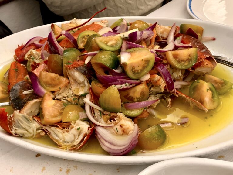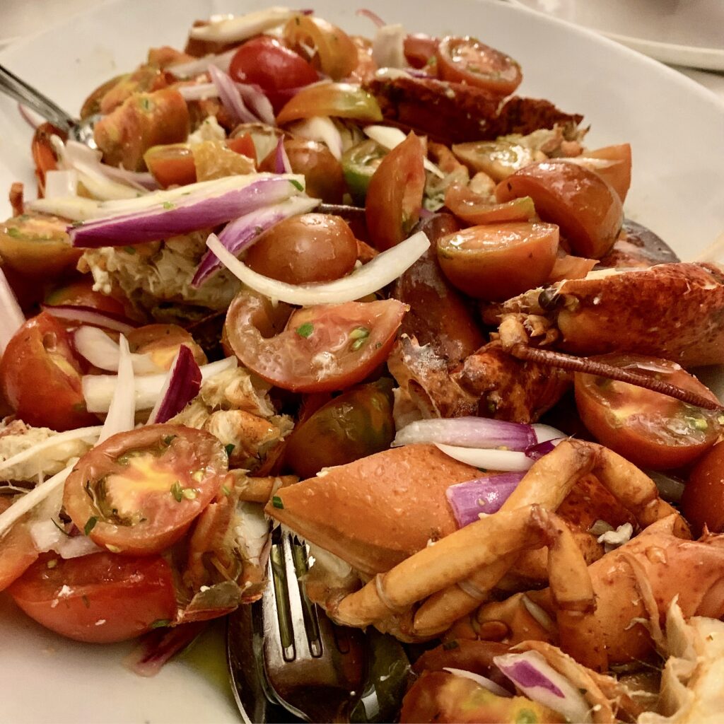 さて、ここでのおすすめは、シンプルにボイルしたオマールエビにトマト、紫の生の玉ネギ、それにワインビネガーとたっぷりオリーブオイルのかかったアスティチェ•アッラ•カタラーナ(Astice alla Catalana)です。とてもシンプルな料理なのですが、この食材のコンビネーションが生み出す味のハーモニーがなんとも言えず美味しいのです。また、量がとても多い! 4、5人分オーダーするとかなりでっかいお皿に盛られてきます。ここにくるお客さんのほとんどはこのアスティチェ•アッラ•カタラーナを食べています。