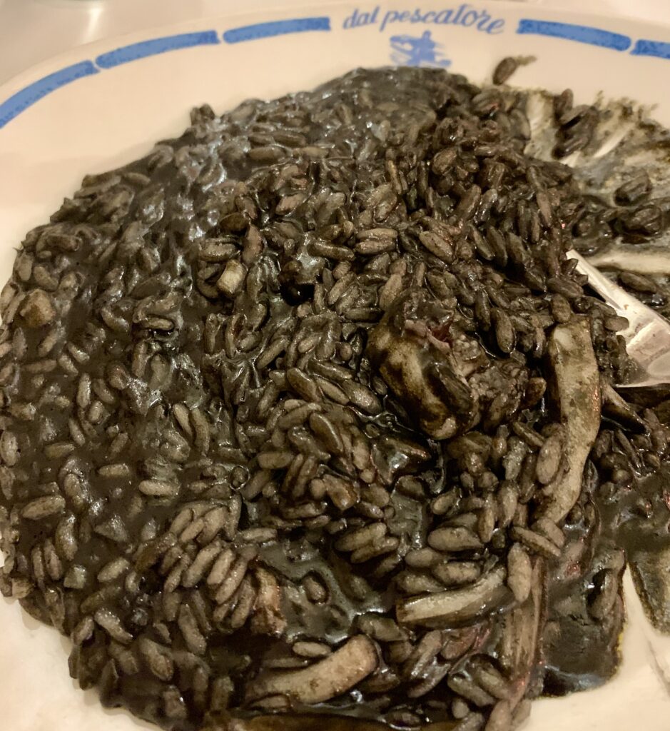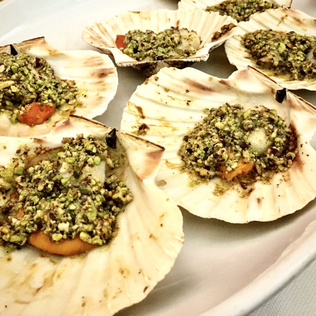 他にここでいつもオーダーする前菜はピスタチオ風ホタテ貝(Capesante gratinate al pistacchio)です。それからファーストはイカ墨リゾット(Risotto al nero di seppia)を頼みます。おすすめです!