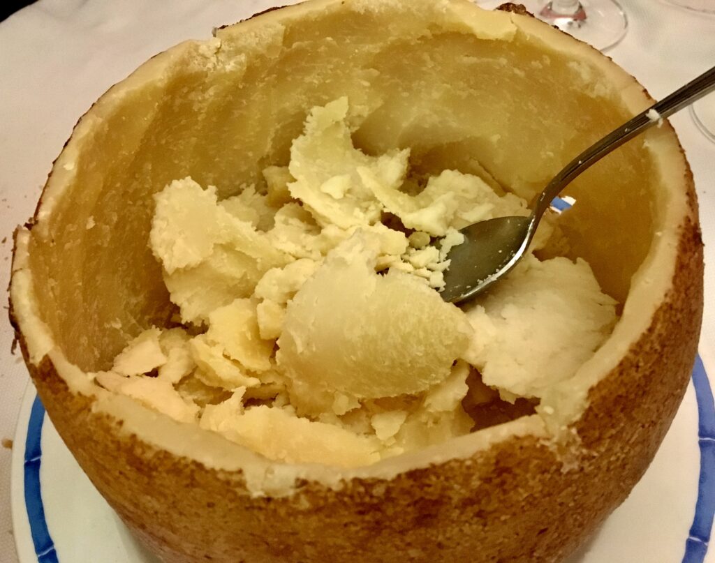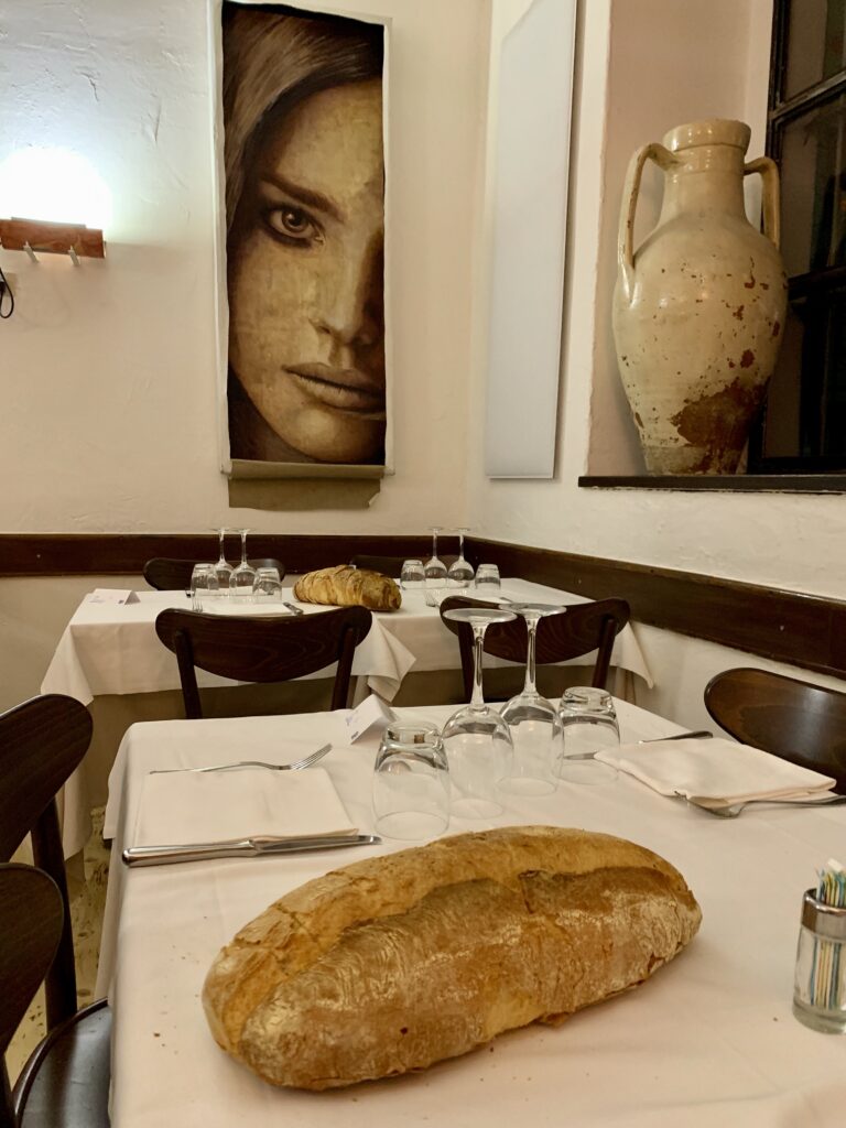 こちらのレストランの特長は、初めからもう置いてある大きなパン、とても大きくとてもおいしいので、ついついたくさん食べてしまい肝心な魚料理が食べれなくなります。このパンには注意した方がいいですよ!それで、食事が終わったら羊の乳からできたペコリーノチーズとミルト(サルデーニャで有名なお酒で、味はちょっと養命酒みたいな感じ)がサービスで出されます。